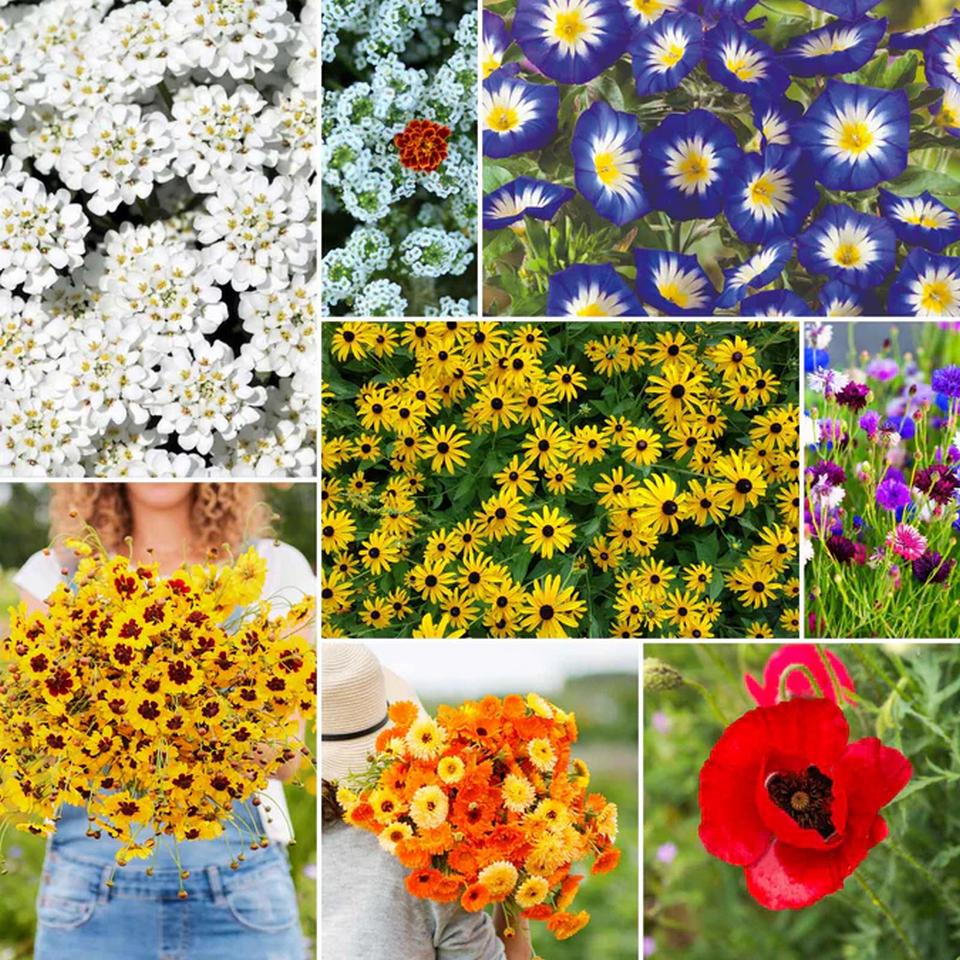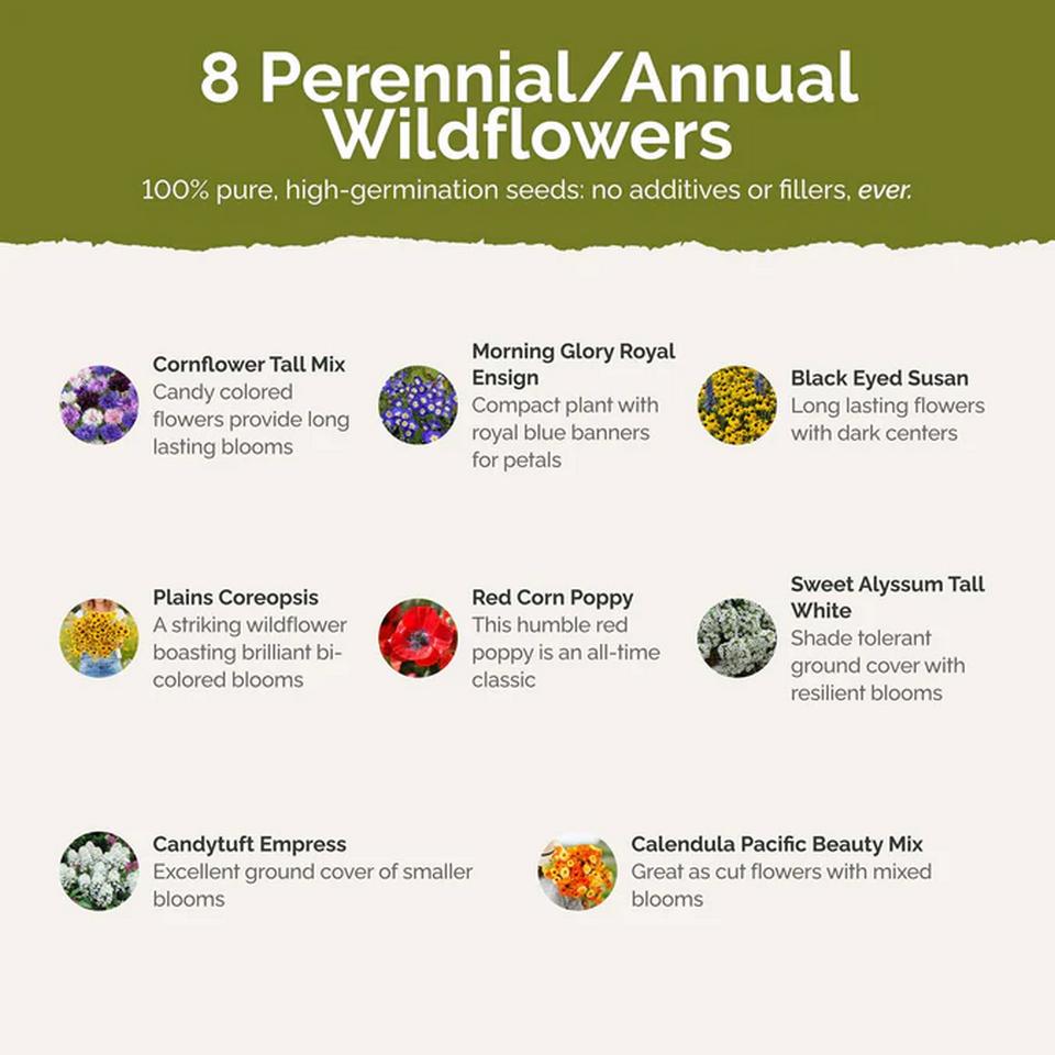 75% Annual, 25% Perennial: Cornflower Tall Mix, Morning Glory Royal Ensign, Black Eyed Susan, Plains Coreopsis, Poppy Red Corn, Alyssum Tall White, Candytuft Empress, Calendula Pacific Beauty Mix